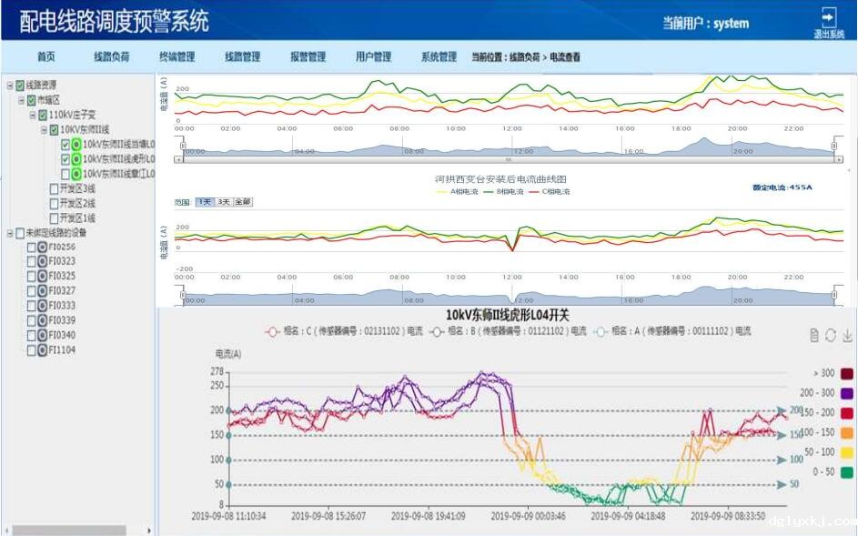 导线负荷温升监测系统综合运用了太阳能取电、无线通信及信息网络等现代科学新技术。能实时准确地在线监测线路状态,并将所采集到的负荷及温度等信息发送回主站中心;主站对信息进行数据统计、分析、拓扑计算,确定负荷温升状态,从而引导工作人员定位隐患。为提高相关工作人员的效率、减轻劳动强度提供了一种强有力的手段;同时,温度信息会通过短消息发送到供电局生产管理部门、线路专工、线路维护负责人等设定的相关人员的手机上,能有效提高线路故障检测的自动化水平,及时为线路安全性能监测提供科学有效的依据,为电力的输送及减人增效提供条件。