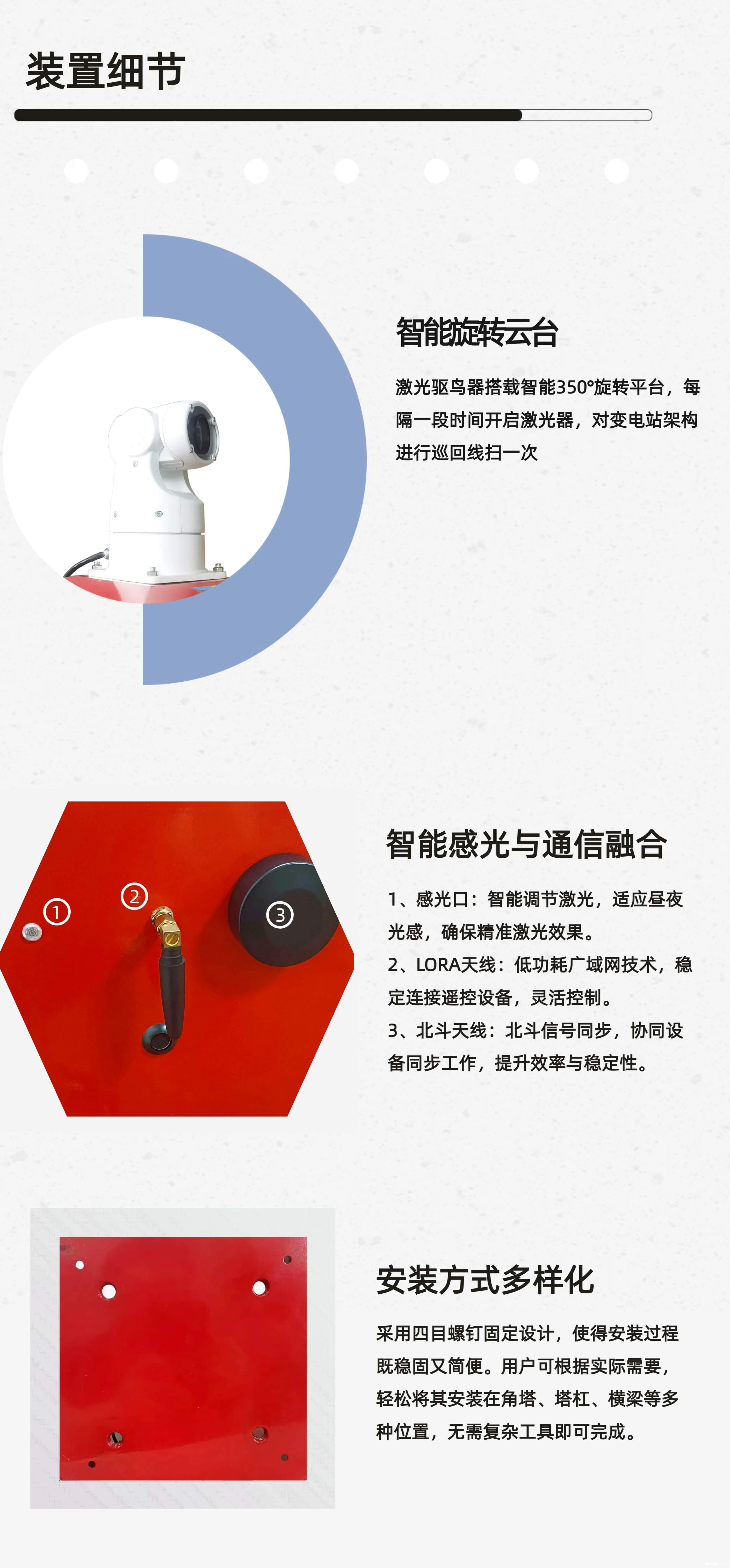 激光驱鸟器是我公司针对变电站安全防护专门研发的一套驱鸟设备,通过发出对鸟类视觉最为敏感的520nm绿色激光从而达到驱鸟目的。设备全程自动运行,为变电站的安全运行提供有力保障。