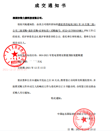 深圳市特力科故有公司:很高兴地通知您,由我公司组织招标的薛家湾供电局2021年10月第二批-公司二级采购一竞价采购-后审标段(采期编号: 0722-217fe693nnb)评标工作已经结束,经评审委员会认真评审推荐并经公承,委托单位审核确认。贵单位为该项日成交人。标段名称: 003-2021年变电管理处betvlctor登录网站购置,成交通知如下: